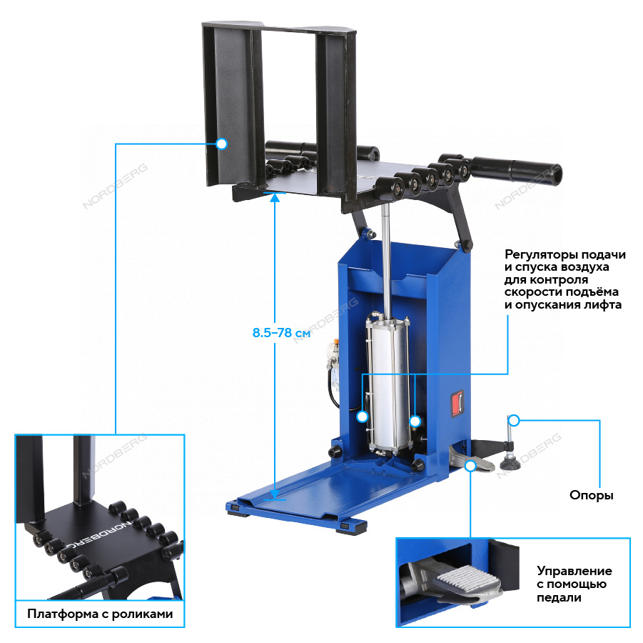 NORDBERG NTL20 — пневматический подъёмник, предназначенный для вертикального подъёма и перемещения колёс. Работает от системы сжатого воздуха и используется для установки колеса на рабочую поверхность шиномонтажного станка с минимальной физической нагрузкой на оператора.
